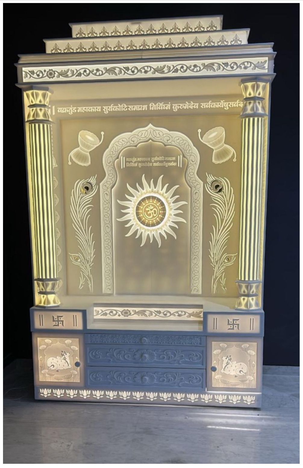 Elevate your sacred space with the Corian Mandir With High End Design — a masterfully crafted piece that blends royal architectural elegance with modern functionality. The arched backdrops, intricate detailing, and symmetrical layout mirror the timeless aesthetics of grand Indian temples. Each niche is beautifully backlit with warm lighting to highlight the sacredness of your idols. The premium Corian finish ensures durability, cleanliness, and unmatched visual appeal. This mandir is perfect for those who seek a balance of tradition, luxury, and modernity in their spiritual spaces. Ideal for spacious interiors or dedicated pooja halls, this high-end mandir offers both seating and storage—making it as functional as it is decorative. Transform your home into a temple of peace, devotion, and style.